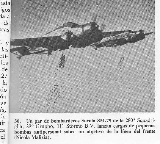Andrés esta de acuerdo con prácticamente todo lo dicho en el mensaje, incluso nos da detalles de la "bombeta" antipersonal que nombra C. (116 mm de alto por 70 de diámetro). Únicamente pone como pega su origen. En manuales del Servicio de Recuperación de Material de Guerra de la época, la nombran, y cito textualmente "Botella de Líquido Inflamable Roja".También nos ha mandado una interesante fotografía de un avión italiano arrojando, al parecer, este tipo de bombas. Pulsa este enlace si la quieres ver y opinar. Cavalls, nos amplia de nuevo información sobre este artefacto: