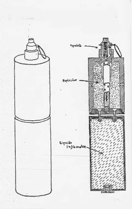 "...vimos el recipiente de la bomba de líquido inflamable transformada circunstancialmente a bomba de mano. En el tapón de llenado, llevaba uno de latón con un orificio donde iba alojado un multiplicador con una mecha. La carga evidentemente no era líquido inflamable, sino algo parecido a lo que llevan las granadas de mano normales." Esta interesante aportación nos demuestra que el reciclaje no es un invento de los años 90, sino que era utilizado en España en la década de los 30.