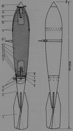 .Bomba PuW tomada de la página http://www.wwi-models.org/Photos/Various/Bombs-german/index.html y gráfico, con espoleta PuW para bomba de 100 y 300 Kg, extraído del libro Uzbrojenie lotnictwa polskiego 1918-1939 de Adam POPIEL