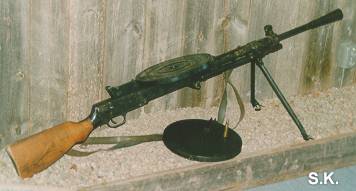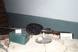 Diseñada por Vasily Degtyarev en 1921, su nombre completo es Ruchnnoi Pulemyot Degtyareva Pakhotnyi (Arma Automatica de Infanteria Degtyarev), lógicamente, su nombre se suele abreviar con las siglas DP. Otros modelos pueden ser el "Degtyareva Tankoviy DT" para ser usado en carros de combate y "Degtyareva Aviatsionnyj DA" para ser usada en aviones. Simple y robusta en su construcción, fácil de montar y desmontar, tiene como inconveniente las altas temperaturas que alcanza su cañón y el relativamente complicado sistema de recambio, siendo necesario una llave especial para cambiarlo (estoy seguro que muchas veces, en el frente, algún españolito dijo eso de "...donde están las putas llaves".) Su principal característica es su cargador circular, con capacidad de 47 cartuchos de calibre 7,62 ruso.  |
