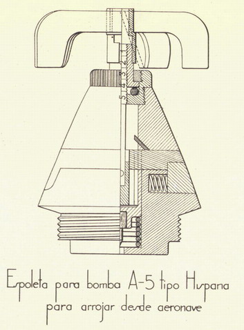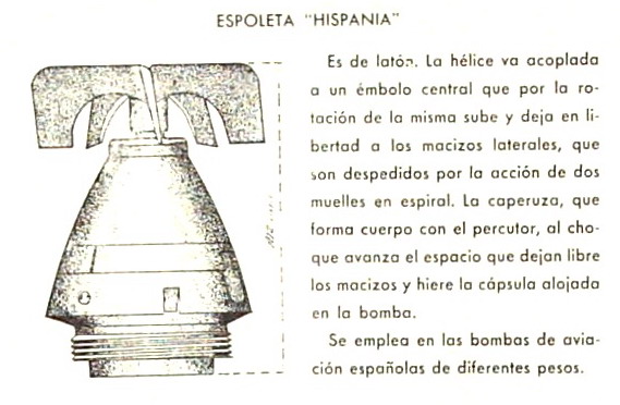 La espoleta Hispania fue patentada en 1924 y fabricada por la empresa Talleres de Guernica S.A. que la denominó "Una espoleta aplicable a toda clase de bombas para ser lanzadas desde aeronaves o con morteros de trinchera".Su funcionamiento es el siguiente: Una vez arrojada la bomba, previamente extraído el pasador de seguridad, y por acción del aire sobre su hélice, esta desenrosca el vástago unido a la pieza de retenida de las masas. Una vez liberadas estas y por efecto de los muelles, dichas masas se desprenden permitiendo a la pieza superior, que actúa como portapercutor, que ante el impacto de la bomba el percutor hiera la cápsula iniciadora produciéndose la explosión de la bomba.