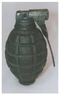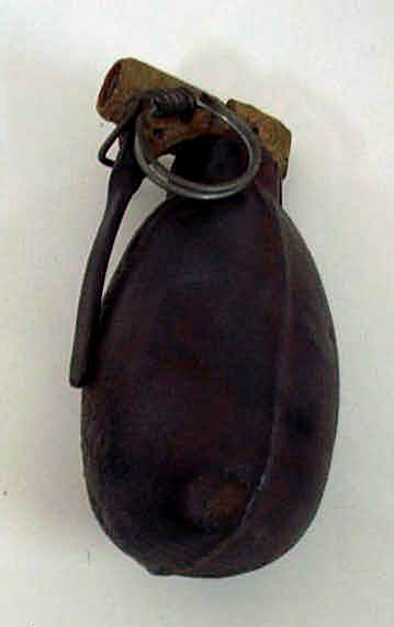 Es una granada de piña que, como se puede ver, tiene el cuerpo prefragmentado con 40 segmentos (8 filas por cinco). Lo curioso de ellas es la espoleta que porta, que Andrés ha venido a denominar "De Mecanismo Horizontal" (este mismos mecanismo aparece en otras granadas, como por ejemplo las de "PERA" que vemos en la imagen inferior). Andrés nos describe así el funcionamiento de la espoleta: