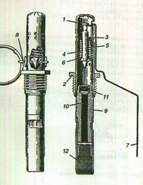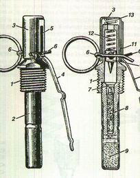 Al lanzarse la granada, una vez quitada la anilla, por la acción de un muelle sale despedido la pieza formada por la caperuza y la palanca, liberándose la bola que deja libre a la pieza percutora, que incide sobre el pistón iniciador impulsado por su muelle. En cambio, en la espoleta UZRG el percutor, que tiene un tetón en su parte superior, es retenido por la palanca de seguridad. Al lanzarse la granada y desprenderse la cuchara o palanca de seguridad, queda libre el percutor que incide, gracias a la acción de un muelle, sobre la cápsula iniciadora. Simple, eficaz y barato, por eso aún hoy se utilizan este tipo de espoletas (mas concretamente su hermana mas joven la UZRGM, que es la misma espoleta pero mejorada). Muchas gracias a Francesco por su ayuda, y el que suscribe se puede ir a la cama, que ha aprendido una cosa más. |