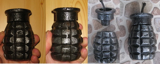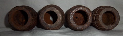 Miguelon nos pasa las siguientes fotos de otro modelo de granada Tonelete de Instrucción. En la primera podemos ver la comparación entre una Tonelete de Guerra. En otras de las fotos se ve con detalle la base de este tipo de granadas y el alojamiento del artificio de fuego. Para verlas en detalle, pulsa sobre ellas.