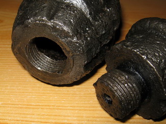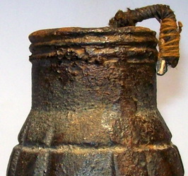 Como podemos ver por los gráficos y la descripción la granada Tonelete original llevaba separados el cuerpo de la granada del artificio de fuego, que se unían mediante rosca antes de ser usados. Esto se aprecia perfectamente en la fotografía inferior, mandada por David, donde está expuesta la denominada Tonelete del Norte, bastante similar a la original al tener separado el artificio de fuego del cuerpo, aunque distinta ya que la original llevaba en su base un orificio de carga cerrado por un tapón de acero. |
