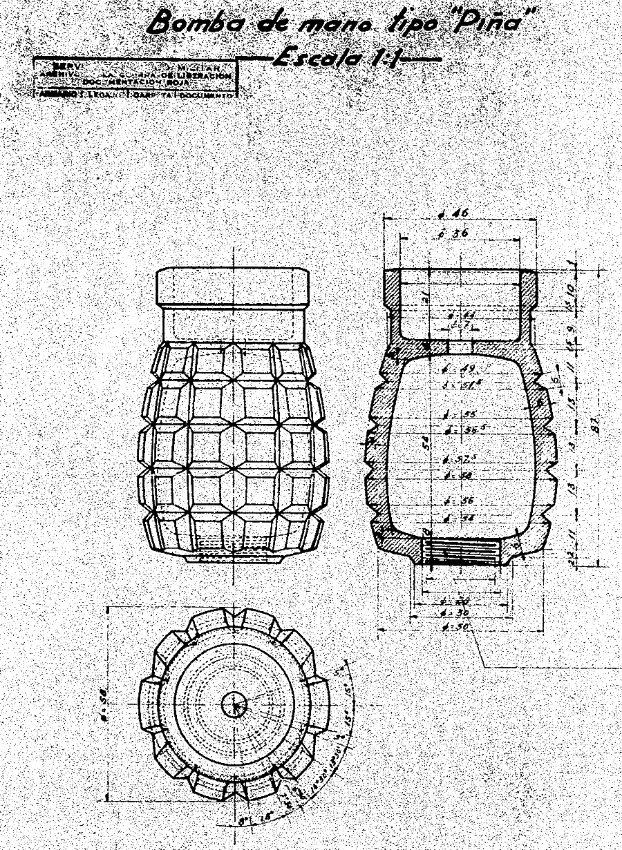 Hemos podido localizar un plano de fabricación de una granada de este tipo a la que denomina "Bomba de mano tipo PIÑA". Desgraciadamente el plano no es de gran calidad, pero por su alto nivel valor histórico aquí lo dejamos para que todos podáis verlo. Para ampliarlo, pulsa sobre él. Por cierto, en varios estadillo del Parque de Artillería número 1 con base en Madrid de fecha Noviembre del 37, he visto un reseñado un material denominado "Granada de mano Piña con mecha". Supongo que referirá a este tipo de granadas. Como el estadillo es bastante curioso por ver los materiales inventariados (la calidad es bastante mala como pasa casi siempre, investigar la historia militar en España es sufrir), también lo dejo. Para verlo con detalle, pulsa sobre él.