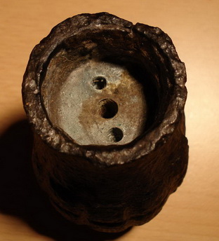 35x20. Tiene una rosca interior para un diafragma que sirve para separar la mecha de su carga explosiva y por los rebajes que lleva en su parte superior debería llevar un tapón que se colocaría con un giro de 90º (como los que se usan para el tapón del radiador de un coche, por ejemplo).