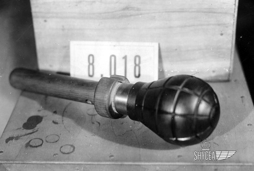La fotografía está tomada en la Exposición del Material tomado al Enemigo celebrada en el Kursaal de San Sebastián de 1938 y catalogada con el número 8018. Si miramos el catalogo que aparece en la revista editada, vemos que dice "Bomba de Mano, Defensiva, Con mango, 1000 gramos, Rusia". |