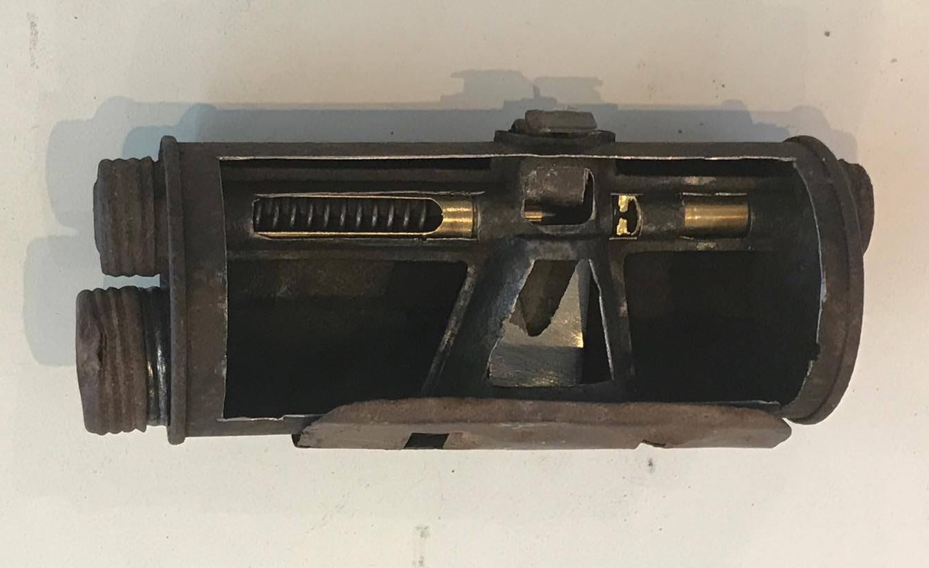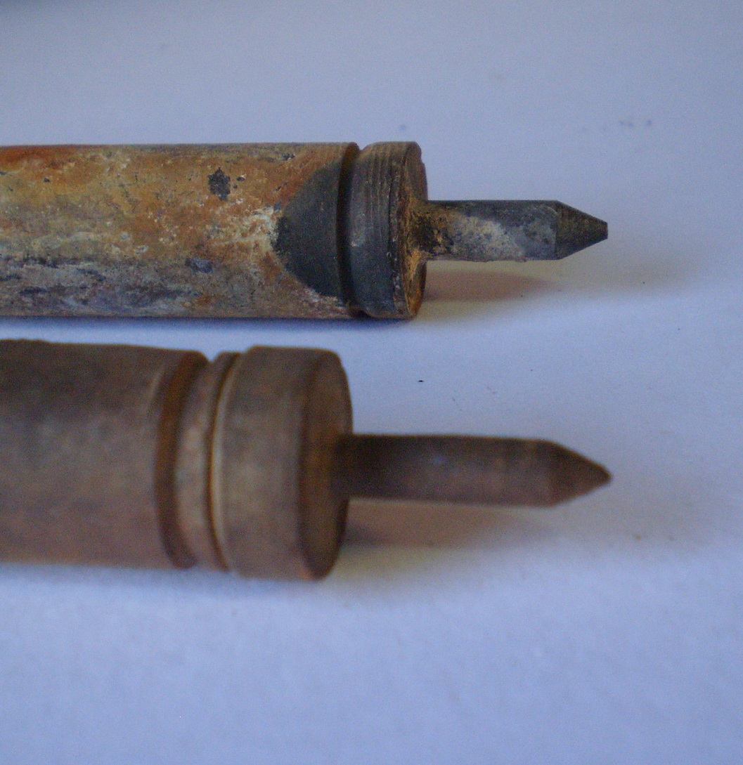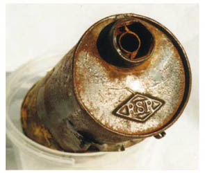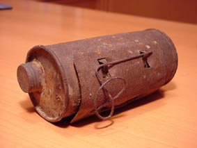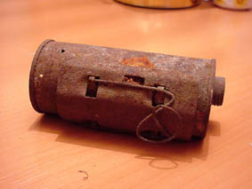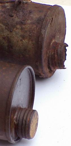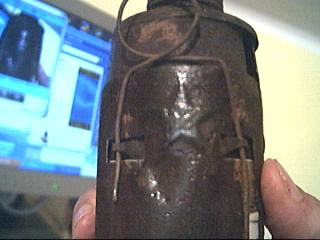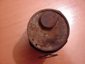 Miguel nos envía estas fotografías de una granada Lafitte que tienen una estrella estampada en su pieza de seguridad y nos interesa saber su origen. Hace tiempo, Stefano, nuestro amigo italiano, nos informaba que las granadas Lafitte o Petardo Ofensivo, como allí se conocía, originarias de su país, tenían grabada sobre la pieza de seguridad una estrella (su aportación se encuentra mas arriba, en esta misma página). A mi (y a Miguel también) me cuesta trabajo creer que llegara una de estas granadas a la zona donde tuvo lugar la Batalla del Ebro (lugar donde apareció este ejemplar) y además no tienen las letras rodeando la estrella que muestra el grafico mandado por Stefano. Por otra parte Miguel nos da otro dato, los tapones de las granadas de origen italiano eran mas pequeños y llevaban unas muescas para su mejor agarre, y este ejemplar es idéntico a las de origen español. Yo que soy muy valiente en mis hipótesis (por eso me equivoco casi siempre) opino que su origen es Republicano y esa estrella no indica su origen italiano sino todo lo contrario. Nos gustaría saber tu opinión sobre el tema y de paso recordar que tenemos como asignatura pendiente identificar el origen de las distintas marcas que aparecen en las granadas Lafitte.