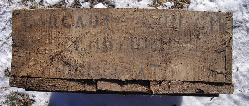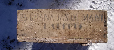 laterales la siguiente leyenda: "25 GRANADAS DE MANO LAFITTE". "PARQUE DE ARTILLERÍA DE PAMPLONA". "PELIGRO 10-3-38". "CARGADAS CON CM. CONSUMO INMEDIATO".