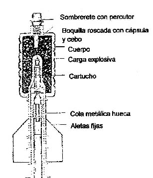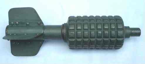 | En la fotografía de la izquierda, podemos observar como esta granada de espiga no sólo era lanzada desde su lanzador (que se puede apreciar en la foto de la derecha), sino también utilizada como bomba de aviación. | |