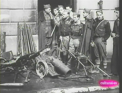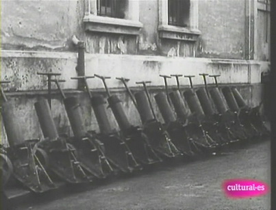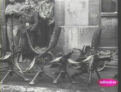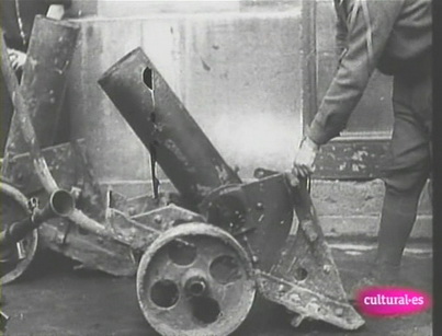 La confirmación ha venido dada gracias a un documental televisado en el segundo canal de Televisión Española. En dicho documental, en un momento determinado, se ven imágenes de la época de diverso material capturado por los Nacionales en el Frente Norte. En esas imágenes se ven, morteros, ametralladoras y... un lanzaminas extraño que inmediatamente identificamos como el mostrado en la página web rusa. Hemos rescatado unos fotogramas para que todos lo comprobéis.