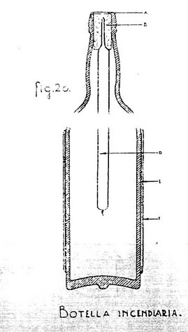 "Botella de Líquido inflamable: Se construyen con botellas corrientes en la forma que se expresa en el grabado, a la cual se ha llegado después de numerosas experiencias, la que está probada en múltiples ocasiones sin que se haya dado caso de que fallase ni una sola botella." |