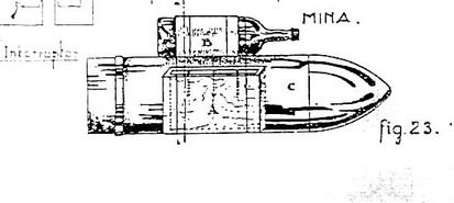 | Por otro lado, el mismo libro nos indica otro uso de las botellas de líquido inflamable (grafico de la derecha): "Se construye aprovechando los proyectiles de artillería del enemigo que no explosionan. Consiste en una botella de líquido inflamable colocada encima del proyectil "c", al que se adosa una caja conteniendo 400 gramos de trilita y dos fulminantes "b", cuyas cabezas salen a una ranura que se rellena con una pasta formada por pólvora y goma arabiga. La parte superior de esta ranura se cubre con papel parafinado y una ligera capa de parafina. Todo envuelto en papel aislante de la humedad y con arpillera. Al romperse la botella, se funde la parafina prendiéndose la mezcla que recubre la ranura, la cual hace detonar el fulminato, explosionando la trilita y con ella el proyectil." | |