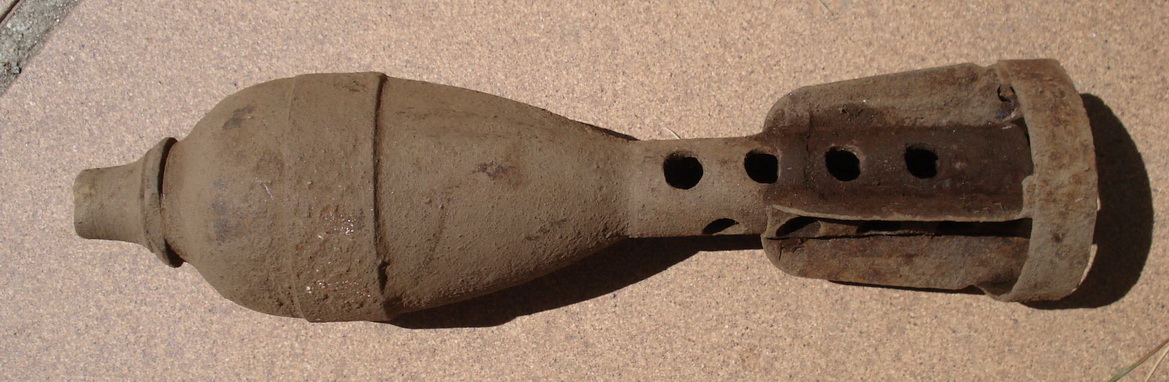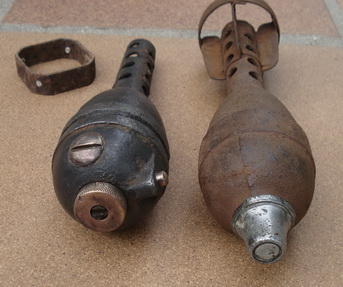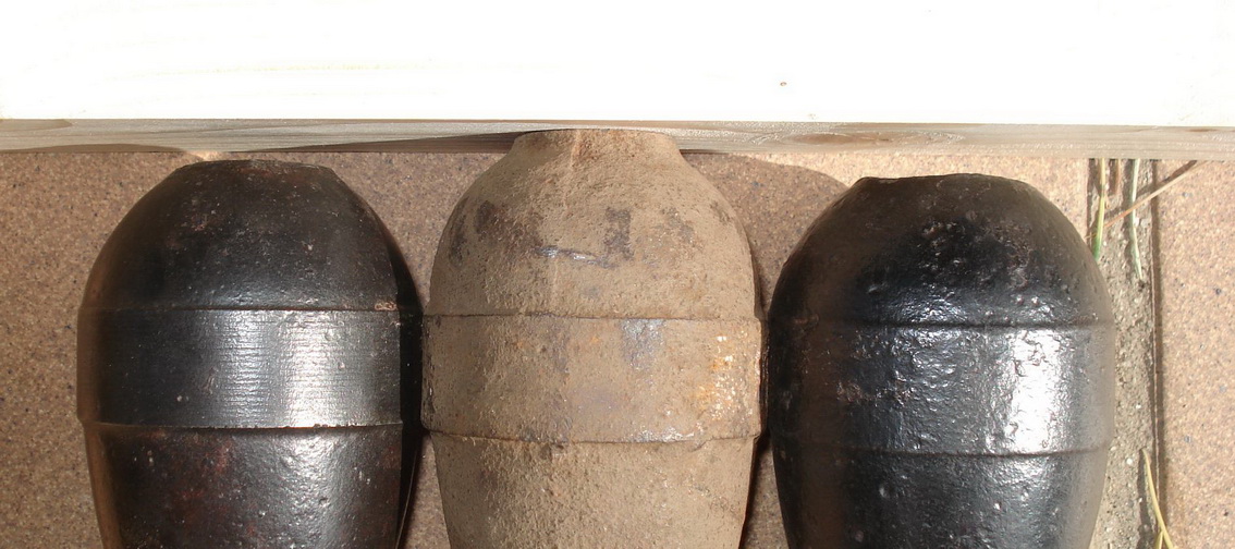 | Un examen mas detallado nos muestra otra reforma de esta granada. Si comparamos esta granada con otro "normal" podemos observar que la ojiva de la reformada es mas larga, como podemos ver en la fotografía inferior, lo que indica que no es un apaño de circunstancias sino una modificación metalúrgica mas profunda. |