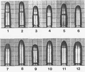 NOMENCLATURA DE LOS CARTUCHOS DE PISTOLA: Es similar a la de las armas largas. Los cartuchos de origen anglosajón se miden expresados en centésimas o milésimas de pulgada, seguido del nombre del fabricante o del primer introductor en el mercado (.38 S/W Special; .380 Auto). Los Europeos y japoneses, el calibre expresado en milímetros, seguido del nombre del fabricante, arma que lo disparaba o introductor (9 mm Parabellum, 7,63 Mauser, etc). Debido a la falta de unanimidad en la denominación de los cartuchos de pistola puede suceder que municiones exactamente iguales tenga distinta denominación, como por ejemplo, .380 Auto es igual al 9 mm corto y 9 mm Bergmann-Bayard es idéntico al 9 mm Largo. |