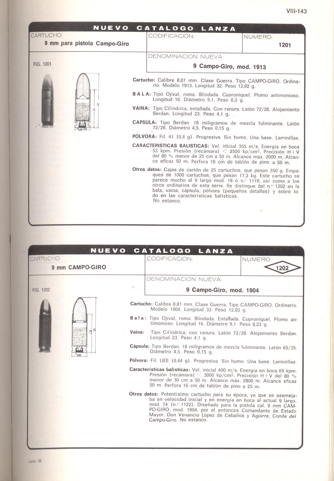 LA MISTERIOSA CARTUCHERÍA DE 9 mm. CAMPO-GIRO Este es el titulo que aparece en la voluminoso Catalogo de Municiones LANZA, cuando pasa a tratar la munición para esta pistola. El cartucho, denominado en España como 9mm Largo, fue diseñado originalmente en 1903 para la pistola Bergmann núm. 6 fabricada en Alemania, pero industrialmente se empezó a fabricar en Bélgica para la pistola Bergmann-Bayard. En España comenzó a producirse en la Pirotecnia Militar de Sevilla desde 1907. Este es el cartucho que utilizó la pistola Campo-Giro en sus primeros diseños, pero según se informa en el catalogo Lanza, se diseñaron en 1904 y en 1913 sendos cartuchos específicos para esta pistola (Para ver la ficha sobre esta munición del Catalogo Lanza, pulsa sobre el enlace).