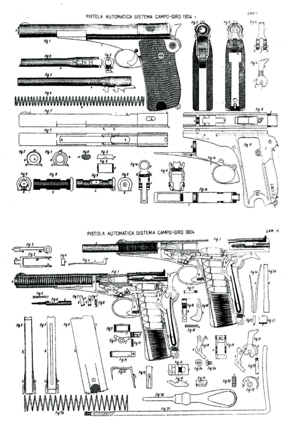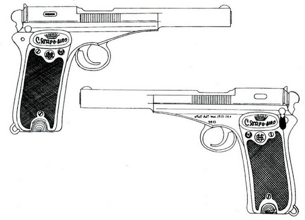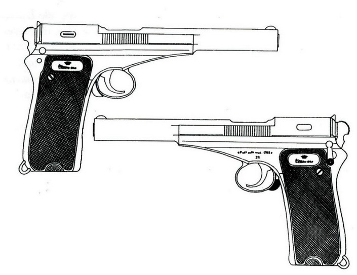 La pistola de la derecha, tanto en los gráficos como en la foto, es la Campo-Giro modelo 1913, la imagen de la izquierda y la pistola de izquierda en la foto, es el modelo 1913-16 |