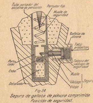 | La espoleta Valero lleva dos sistemas de seguridad. El primero es el denominado "de galleta de pólvora" y el segundo esta formado por "medias cañas" | |