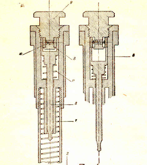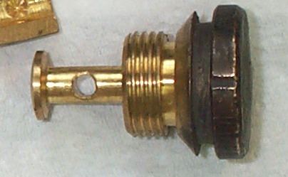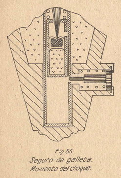 Este pestillo sale al exterior de la granada y tiene un muelle que actúa sobre él en el sentido de echarle hacia afuera. Impide la acción del muelle una galleta de pólvora que se apoya contra el tapón roscado. Este tapón esta agujereado en su centro y lleva un talco protector o una lamina de celuloide para proteger la galleta de pólvora de la humedad. |