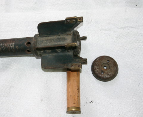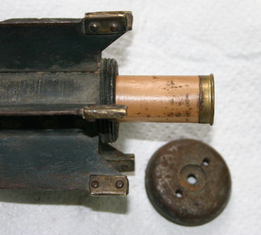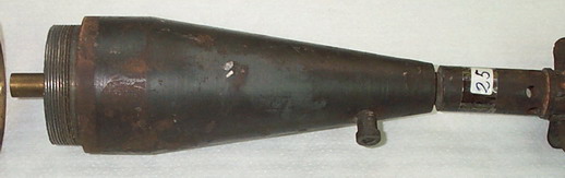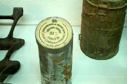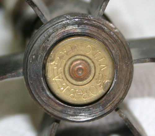 Primero habría que colocar el cartucho de proyección. Este cartucho se coloca en la base de la granada y es de forma similar a un cartucho de caza. Su calibre, para el mortero de 81 mm, era del 16 (según nos informa Jordi, administrador de la excelente pagina www.municion.org unos 18 mm y las Valero de 50 mm usaban uno de 14 mm) y fue fabricado, entre otros sitios, en la fabrica de arma "Orbea".
