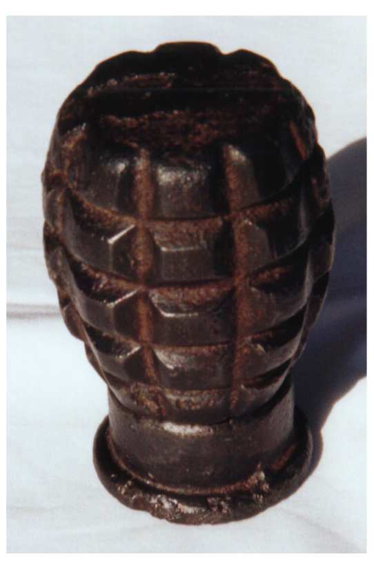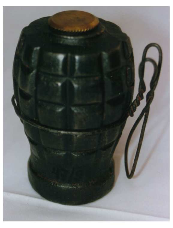 De esta granada existen dos modelos. El número 1 de guerra, es de hierro con estrías exteriores que la dividen en 40 fragmentos. En su base presenta un orificio para la carga atornillado a un tapón de hierro. En la parte superior lleva una tapa de hojalata y en su interior un trozo de mecha lenta con cerillo y rascadera para el encendido. La carga esta formada por pólvora ordinaria. El modelo número 2 es de instrucción y consiste en un tonelete de fundición de hierro de paredes gruesas, abierto totalmente por uno de sus extremos y por el otro un orificio roscado, donde se atornilla el artificio de fuego. Interiormente lleva una carga de 45 gramos de una mezcla de pólvora y de colofonia. Según nos informa David, de esta granada se fabricaron diversas variantes durante la guerra, incluso una de ellas se trasformo en granada de fusil |