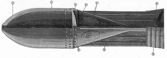 tuviera una mayor resistencia. El cuerpo y el culote (2 y 3) están encastrados y sujetos por medio de tornillos, al igual que el estabilizador, cuyas aletas están formadas por una chapa doblada y unidas con soldadura. El estabilizador presenta como característica el llevar entre las aletas unas aberturas que facilitan la colocación de la espoleta trasera. Dichas aberturas se cierran con una chapa que se sujeta con dos tornillos.