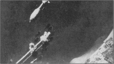 Impactante fotografía donde se ve una bomba de 250 kilos "legionaria" lanzada sobre el puerto de Barcelona. |