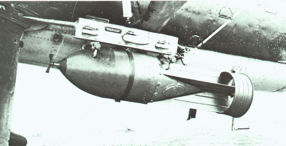 | La verdad, como yo de aviones sólo se que llevan azafatas y que la comisa es malísima, no puedo precisar en este momento que tipo de aparatos usaron esta bomba, aunque con seguridad alguno de nuestros atentos colaboradores nos los indicará. Sobre la foto superior hace unos meses hubo una polémica en el excelente y extinto foro de Detectomania sobre esta bomba, y se dice que la transportaba un Henschel 126 (le doy las gracias a Güendis por la corrección ya que yo había puesto con la torpeza que me caracteriza como Heinkel), al parecer apodados "Súper Pavas". |