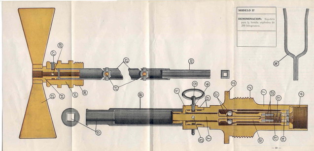 | Utilizaba dos espoletas, una colocada en la ojiva y la otra en el culote. La espoleta utilizada era del modelo 27, que se podía usar indistintamente en ambos lugares. |