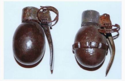 Por una lado el cuerpo de granada corresponde a una granada de mano de procedencia alemana usada en la primera Guerra Mundial. Su nombre real es algo tan raro como EIERHANDGRANATE mod 1917, que en la lengua de Cervantes viene a significar algo tan sencillo como "Granada de Mano de Huevo". Según nos informa Carlos los primeros modelos de la granada no llevaba una banda rugosa en la zona central, que se incorporo posteriormente para facilitar su empuñamiento y su lanzamiento. Originalmente esta granada de mano utilizó tres tipos distintos de espoleta o iniciador, no siendo utilizados ninguno de ellos, por los datos que tenemos, en nuestra Guerra Civil (ojo a este dato para evitar posibles engaños).