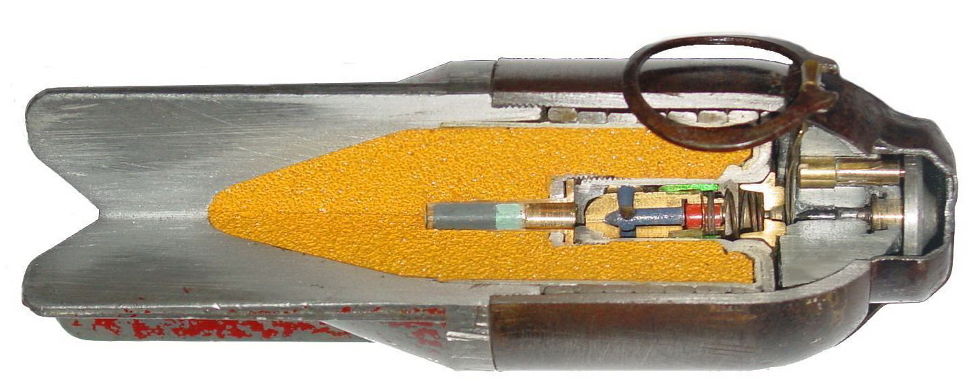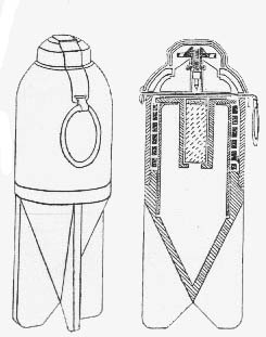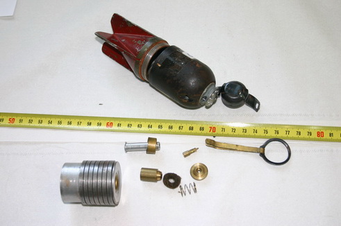 Aquí podemos observar una granada Brixia de 45 mm, con "tapón de marcha modelo Valladolid"