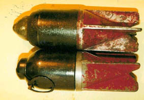 En la parte superior de la fotografía, granada de mortero Breda o Brixia de 45 mm con espoleta VALL, en la parte inferior la granada original.(Fotografía aportada por Oriol).